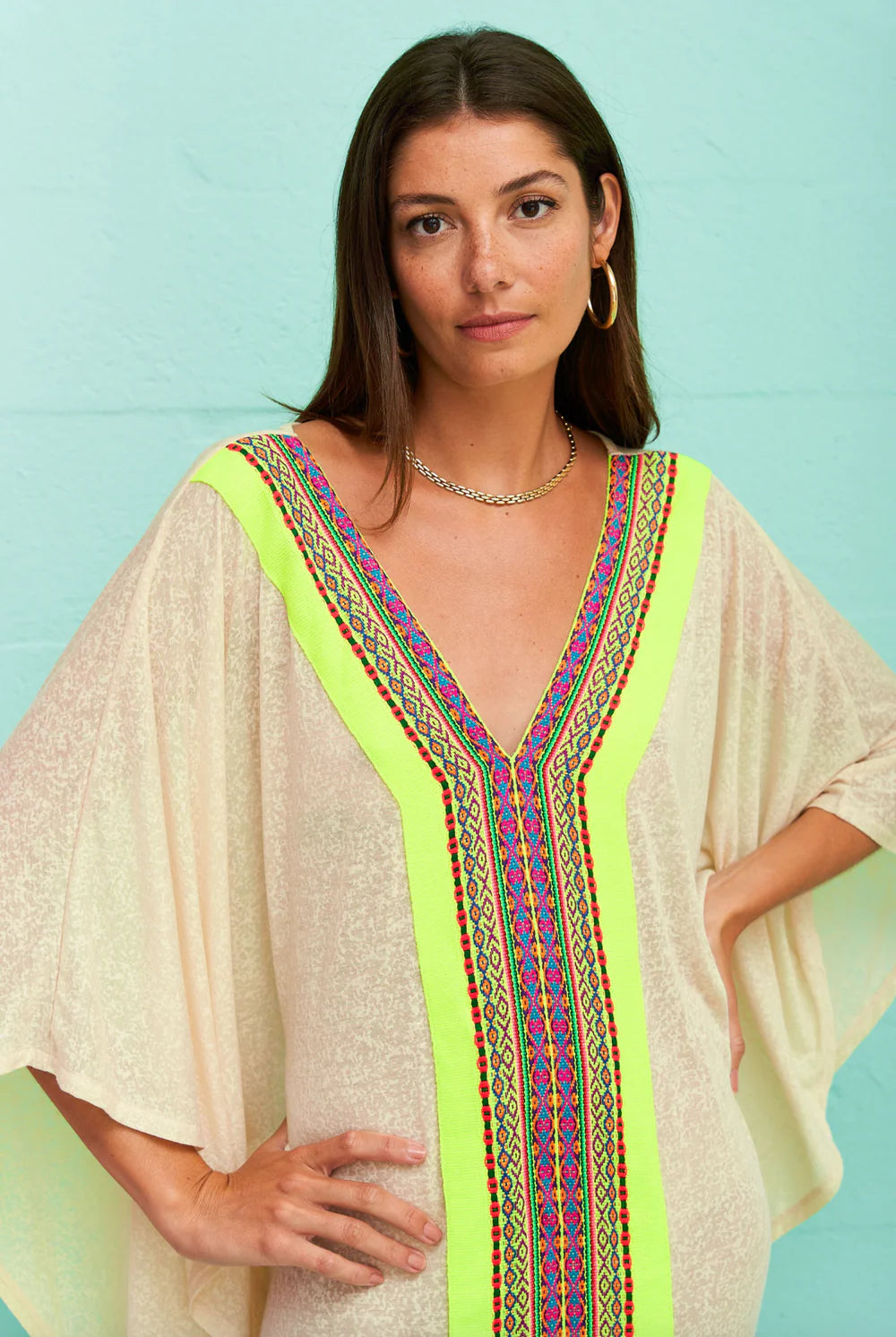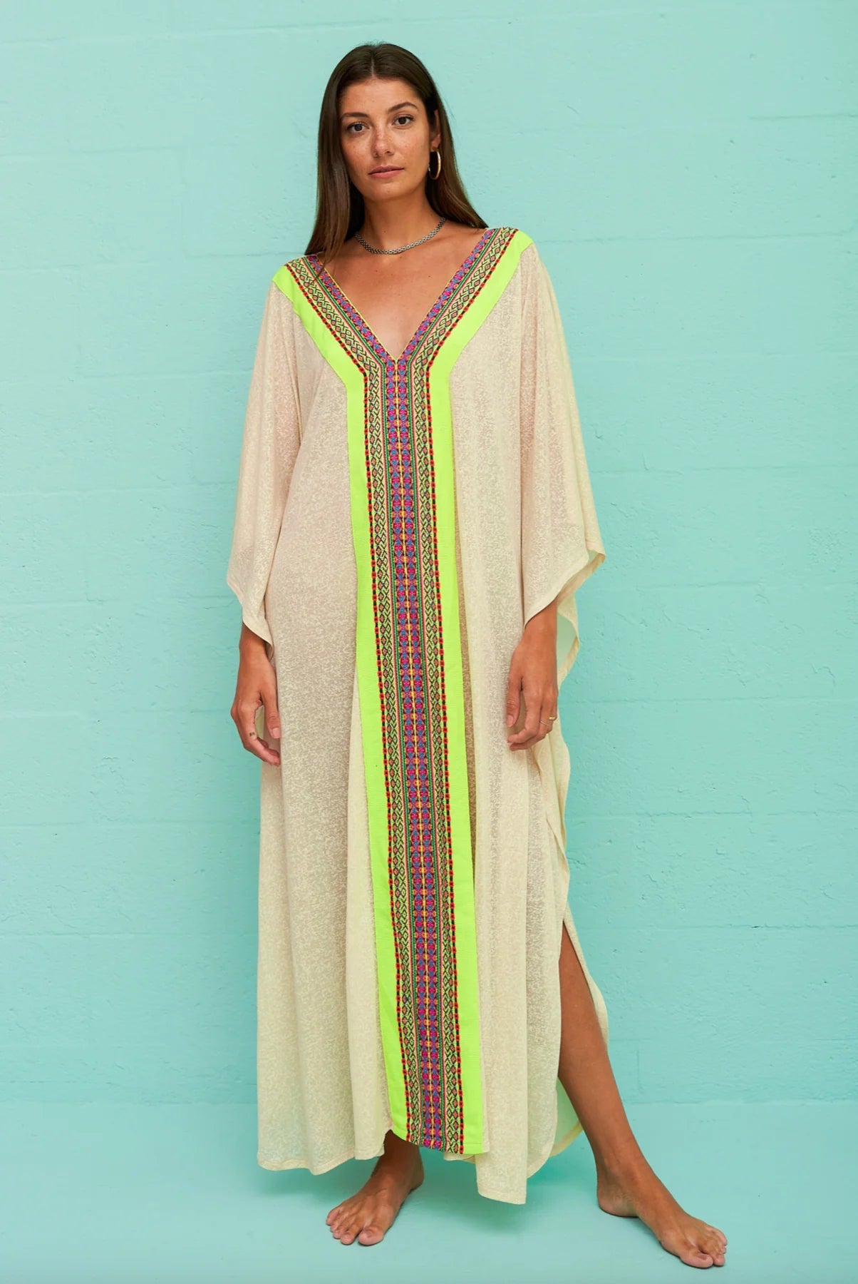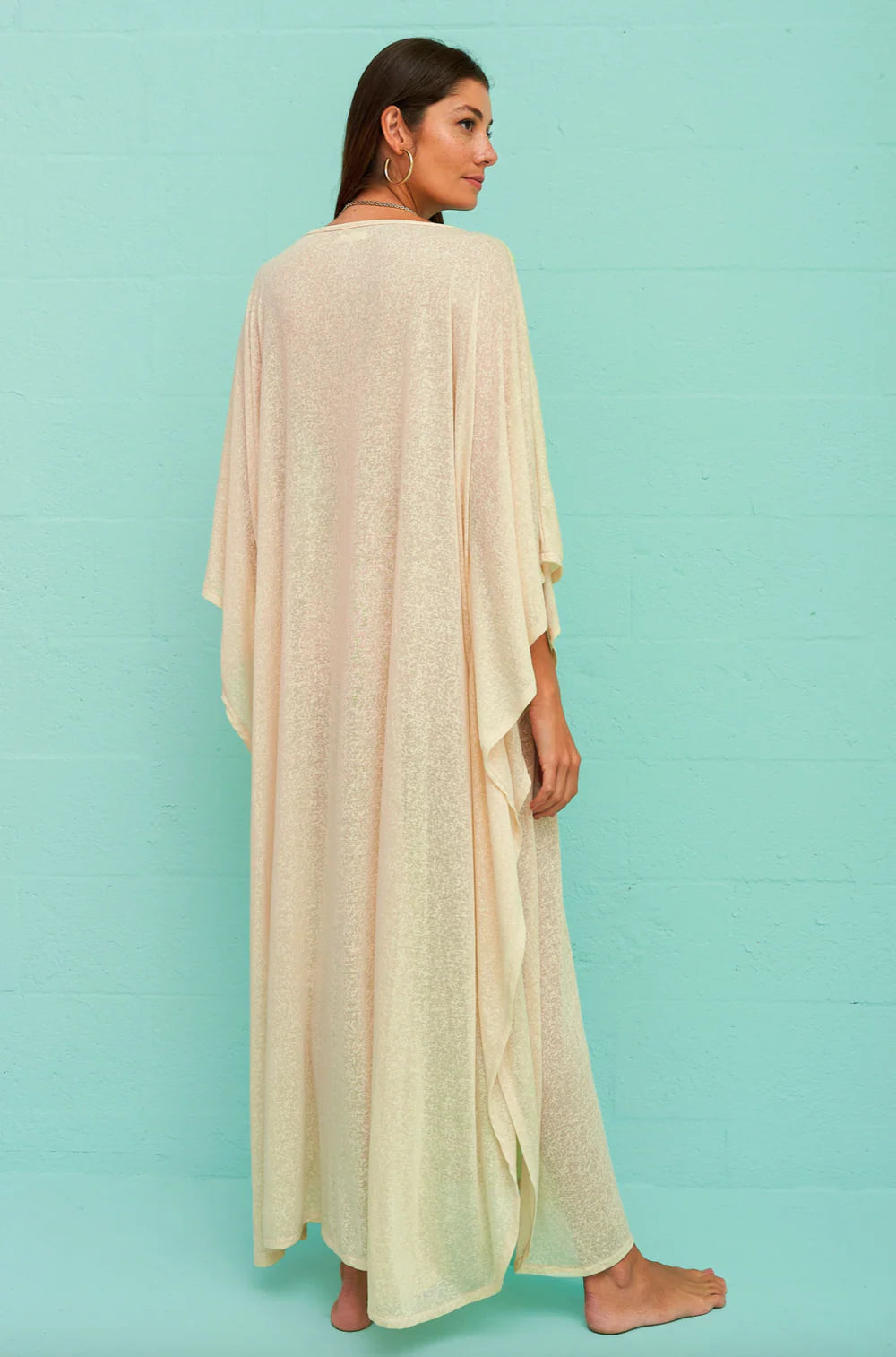 A new take on our best-selling thobe, but in our most adored burnout fabric. This style features flattering deep V-neckline with Inca trim detail and free flowing flutter sleeves that fall elegantly to the ankles.