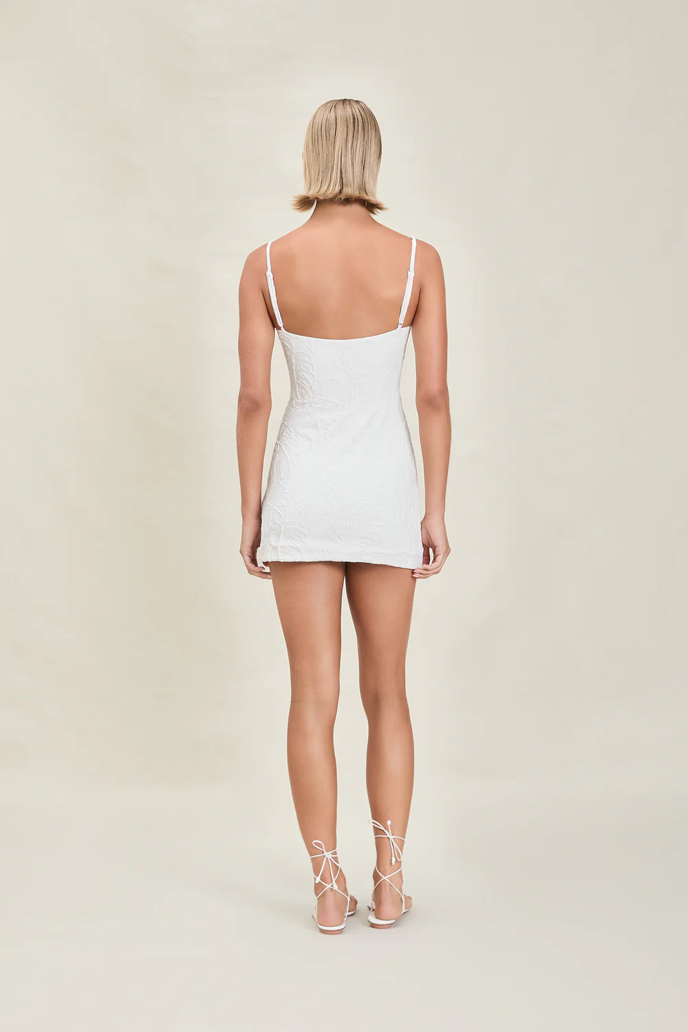 The Imani is a mini dress with a slight cutout in the center front with beading detail and adjustable straps.