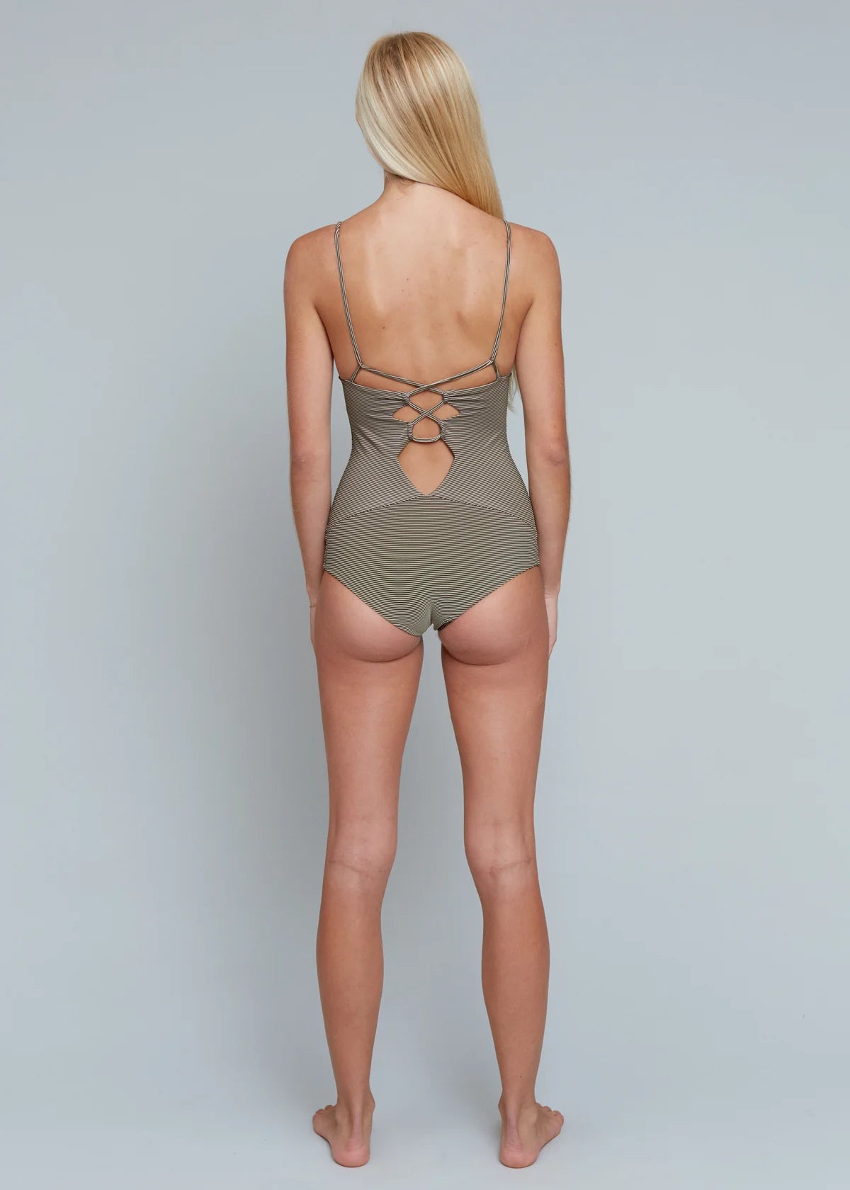 Our best-selling full piece in its original cut. The Kokomo One Piece features cut-out strap detailing at the front and back, fixed shoulder straps, and a straight-across rise at the hips. Offers a sculpted fit with minimal lines.