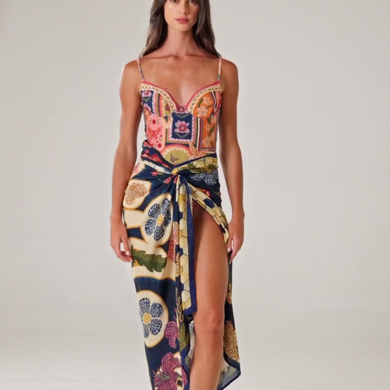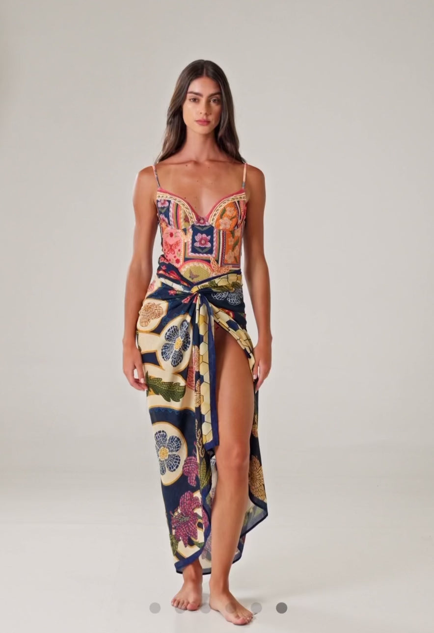 The Petra One Piece features intricate handmade details, designed with an underwire for support, a chic back cut-out, and a secure hook-and-eye closure. Its vibrant placement print, illustrated by our artists, brings a unique and eye-catching touch. Adjustable straps complete the design for a comfortable, personalized fit.