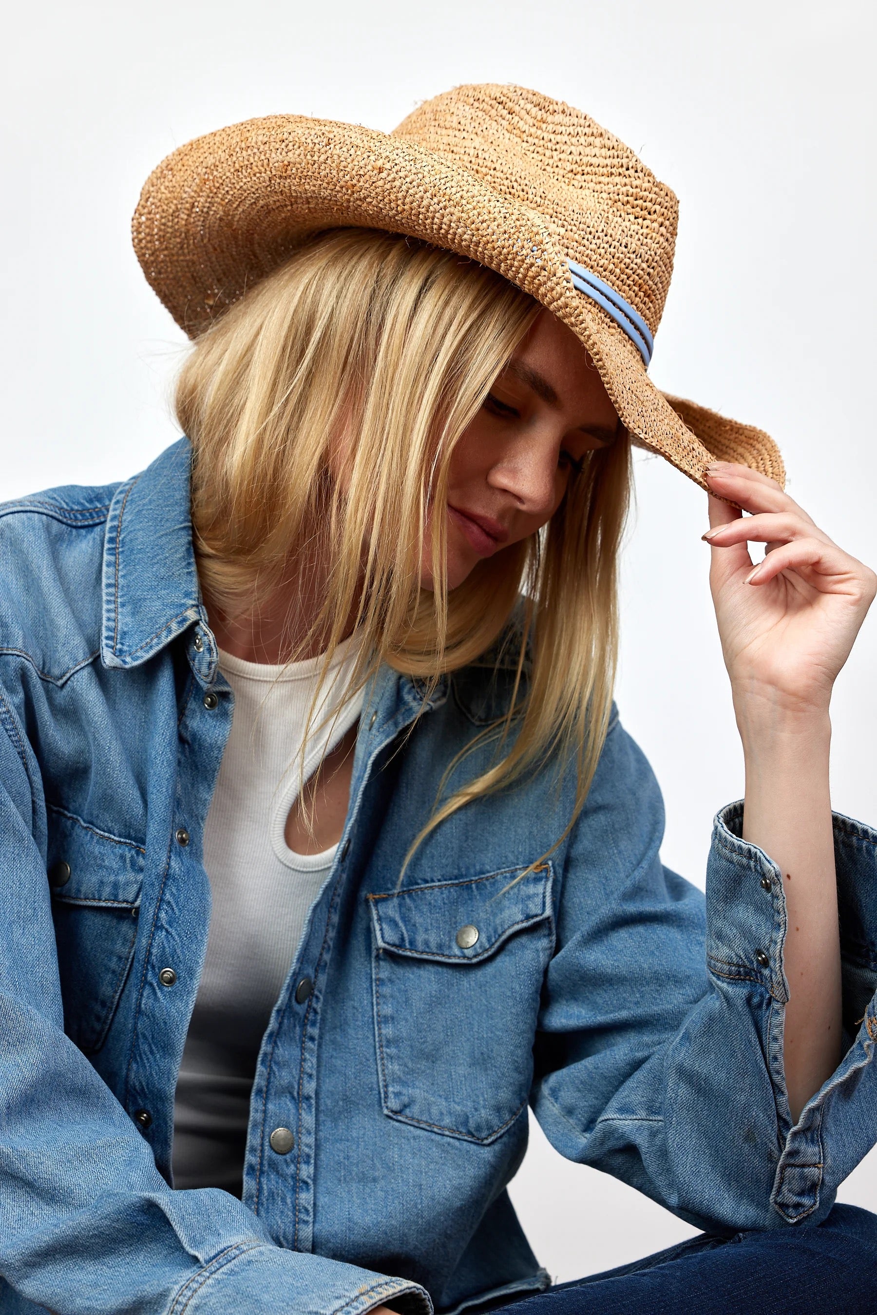 This textured cowboy hat is a staple for your summer hat collection! Crocheted raffia hat is trimmed in a PU leather detail and has an adjustable sweatband for the perfect fit.
