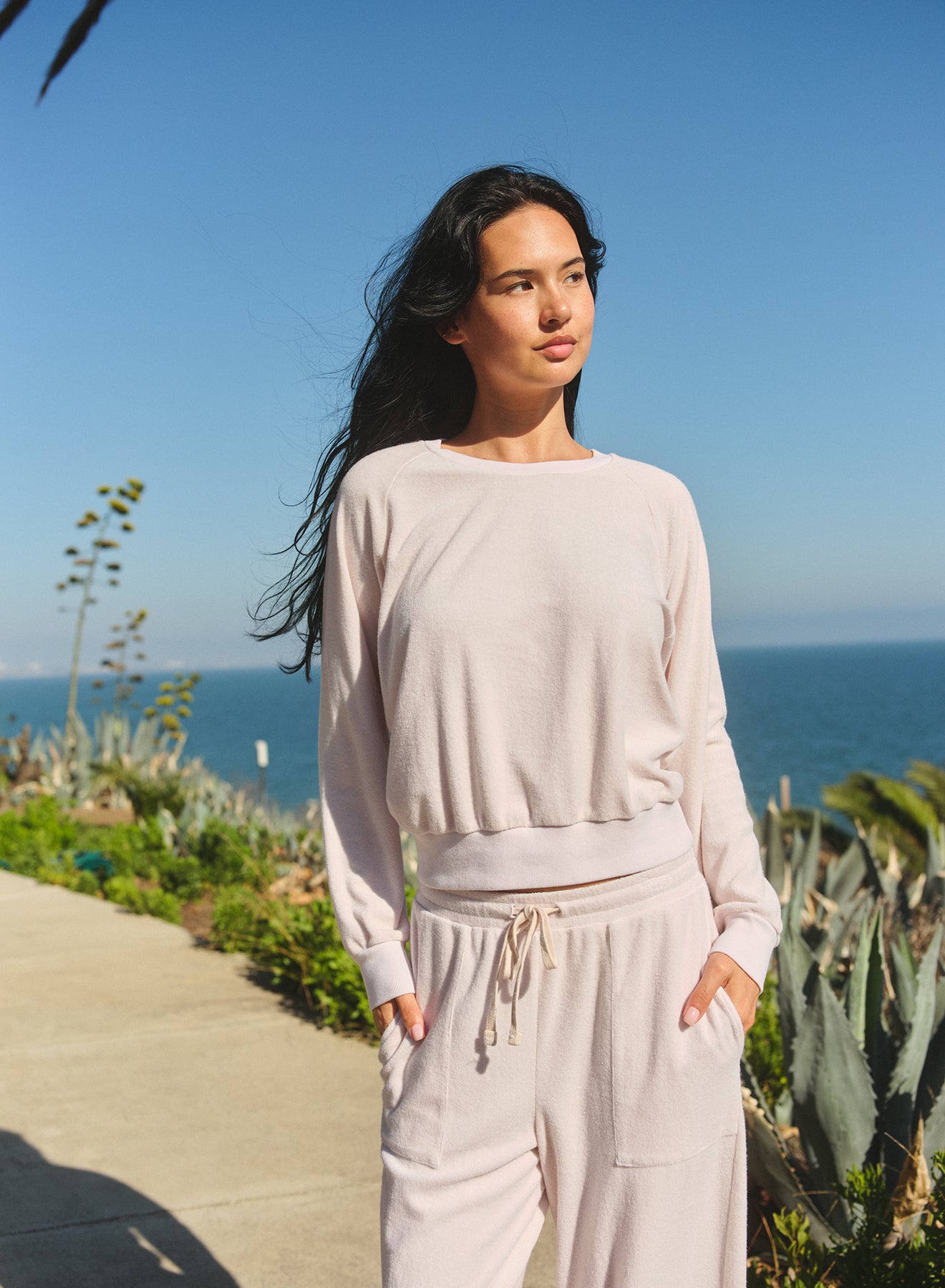 Wide leg terry sweat pant with drawstring adjustable waist in ivory.