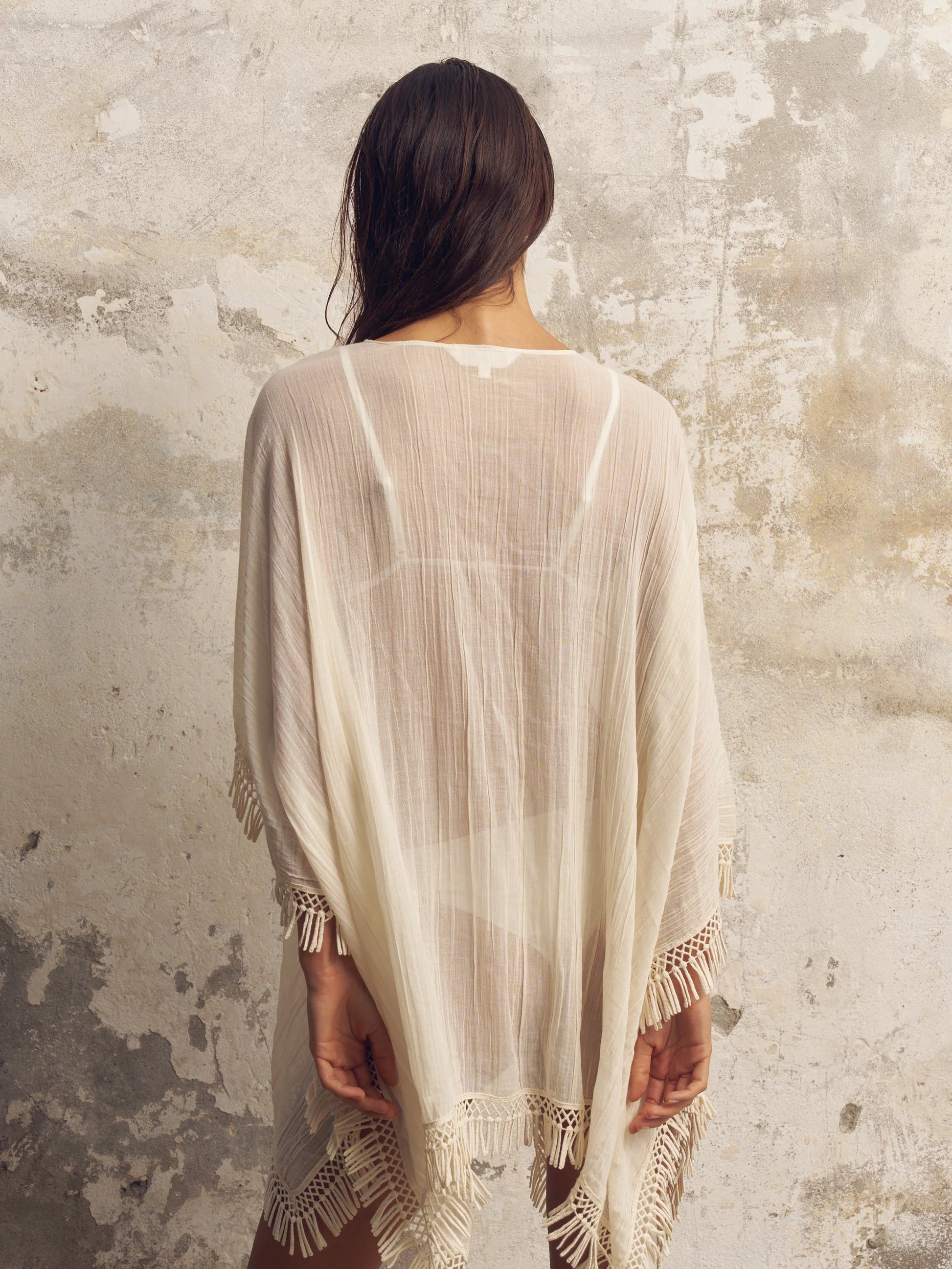 This kimono embodies effortless elegance with its sheer, lightweight texture and fluid silhouette. Designed with an open front and delicate fringe detailing, it offers a breezy sophistication that moves beautifully with every step. Perfect for layering, this versatile piece transitions seamlessly from sun-drenched beach days to balmy evenings, adding a touch of refined bohemian charm to any look.